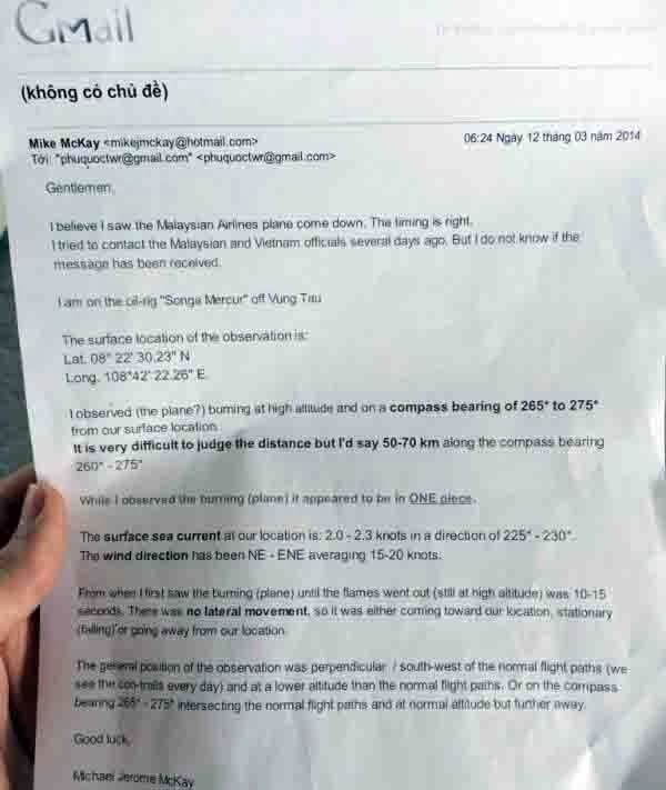 Doan Huu Gia, deputy general director of Vietnam’s air traffic management confirmed authorities had received the email from Mike McKay, a New Zealander working on a rig operating in the Gulf of Thailand.