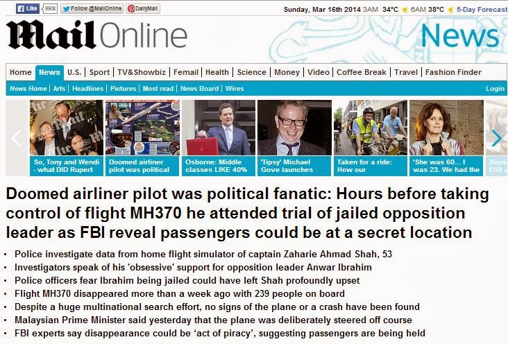 ambiguities and lack of answers. Mailonline coverage however has been as usual vast and a must-watch even though, like the media everywhere (here included) they have published stories, which even if not proven wrong, turn out to be red herrings. The political side of Captain Zaharie was waiting to be done. And indeed Special Branch are duty bound to check everything about the flight crew. But the suggestions that he was involved has clearly upset lot of Malaysians who have been sending strong messages to the media all week that Captain Zaharie was a 100 per cent kind of guy. Professional to the last. And perhaps equally fanatical about his work, his flight simulator, and his DIY videos. But then again both Captain and First Officer must be the prime suspects – in fact they are the only suspects.