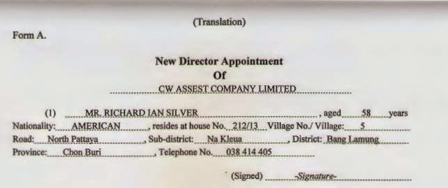 In fact records with the Department of Business Development show that on the 10th of October 2011 Richard Ian Silver became managing director of the company, which has been touting the Abatalay Condo project in Pattaya and he had authority over the company and shareholders.