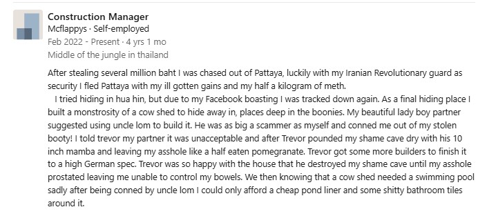 This was not the real Mcnamee of course. We were able to prove digitally that it was Bryan Flowers, posing unconvincingly as Mcnamee. Flowers had run a massive campaign against Mcnamee – a total character assassination. The mikemcnameepattaya gmail address was one of many he had created to troll others. Below are are the header and some content from that Linked in page he referred to.