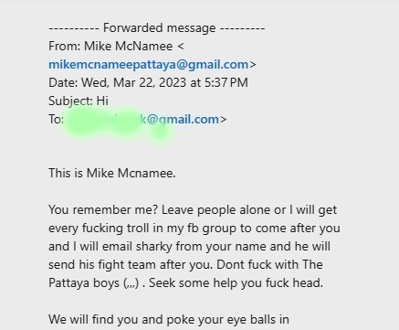 That was an email purporting to be from a well-known Briton called Mike Mcnamee, who ran an Facebook page called Pattaya 24/7 forum rivalling Flowers’ Pattaya-Addicts.com, and Thailand 24/7.