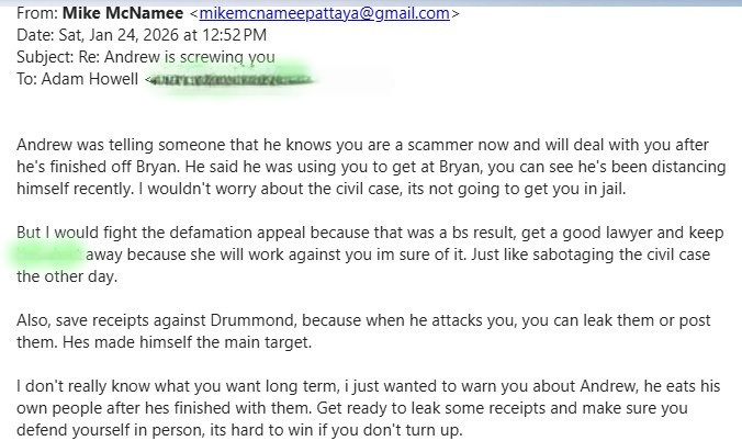 And it goes on. Last month Flowers posed as Mike McNamee again and emailed Adam Howell, who would have known that Mcnamee was an enemy of Flowers. But the advice he gave was off the wall.